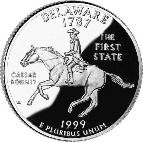 - Delaware’s state quarter features Rodney on horseback.