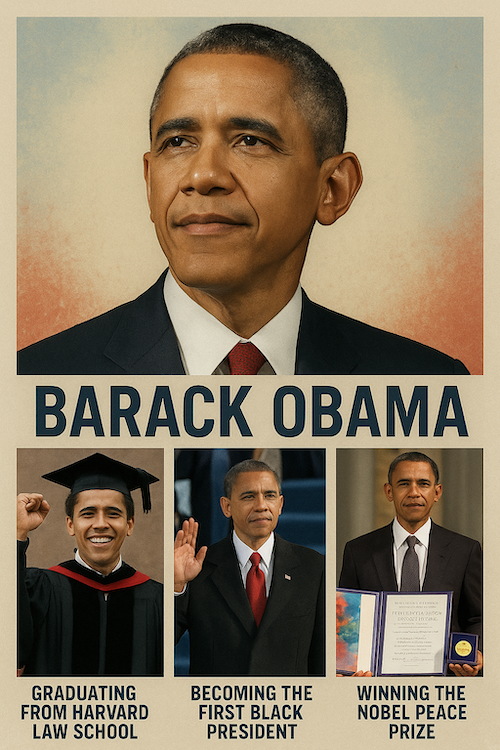 Early LifeBarack Obama was born in Honolulu, Hawaii, in 1961. His father was from Kenya, and his mother was from Kansas. After their divorce, Barack spent time in both Indonesia and Hawaii. He was raised mainly by his mother and grandparents. He went to Punahou School in Hawaii and later studied at Occidental College in Los Angeles and Columbia University in New York. Community Work and EducationAfter college, Obama worked in Chicago as a community organizer, helping neighborhoods affected by job losses. He then went to Harvard Law School and became the first Black president of the Harvard Law Review. After graduating, he worked as a civil rights lawyer and taught constitutional law in Chicago. Family LifeBarack met Michelle Robinson while working at a law firm, and they married in 1992. They have two daughters, Malia and Sasha. In 1995, he wrote a book called Dreams From My Father about his life and family. Political CareerObama was elected to the Illinois State Senate in 1996 and to the U.S. Senate in 2004. In 2008, he was elected the first African-American president of the United States. He passed the Affordable Care Act to expand health care access. In 2012, he was re-elected for a second term. Second Term AchievementsDuring his second term, Obama worked on immigration reform, climate change, and improving relations with Cuba and Iran. He supported same-sex marriage, expanded clean energy programs, and continued to promote health care and equality for all Americans. |
