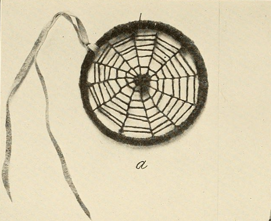 Snowshoe Dance performed by the Ojibwe - Painting by George Catlin Ojibwe Spider CharmThe Ojibwe spider charm, more commonly known today as the dreamcatcher, is a traditional object used to protect sleepers, especially children, from bad dreams. Made from a hoop of willow with a woven web in the center, it was often decorated with feathers and beads. According to Ojibwe belief, the charm would catch harmful dreams in its web while allowing good dreams to pass through the center hole and gently slide down the feathers to the sleeper below. The morning sun would destroy any trapped bad dreams. Over time, the dreamcatcher became a widely recognized symbol of Native American culture.