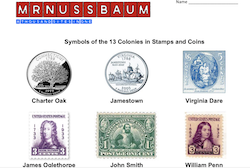 This printable illustrates how elements of the 13 Colonies are honored on American coins and stamps and challenges students learning about the 13 Colonies to design their own coin and stamp representing the colonies.