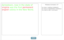 These activities require students to correct the faulty grammar, puncutation, and spelling of sentences and paragraphs about the 13 Colonies. The system gives immediate, dynamic feedback.