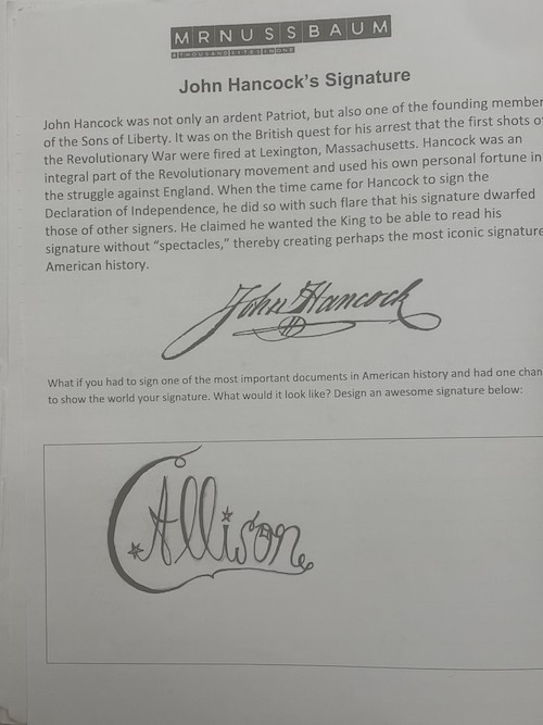 | This American Revolution/Revolutionary War activity tells the story of the iconic John Hancock signature on the Declaration of Independence and then challenges students to come up with their own, creative signature. |