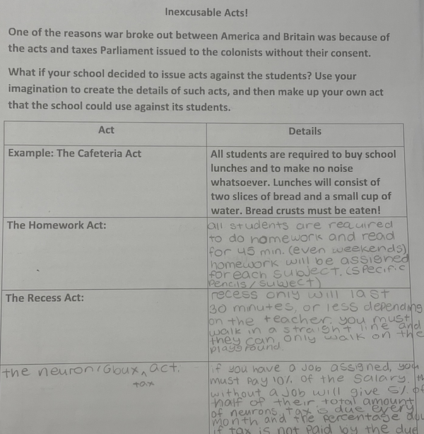 This activity requires students to imagine their school institutes unjust acts against them such as the Homework Act and Cafeteria Act similar to the Stamp Act, Townshend Act, and Intolerable Acts. It then requires students to fill in the details of such acts before coming up with one of their own. Students get to play the bad guy! |