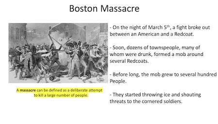 Click Here to Download the Boston Massacre Power Point PresentationThis presentation can serve as the perfect guide for your Boston Massacre Lesson. It covers the following: